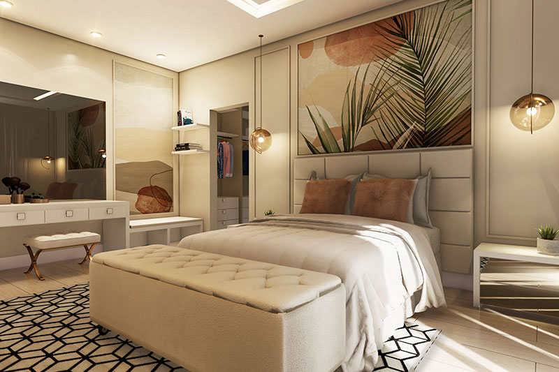 This is undoubtedly one of the most imposing houses we have ever designed. With a beautiful neoclassical façade, this townhouse has 3 parking spaces. Entering through the main door, we have a living room already overlooking the staircase and a bar. In the background we have a great area of leisure, with barbecue, deck and pool. In total there are 4 dormitories, one of them in the ground floor.