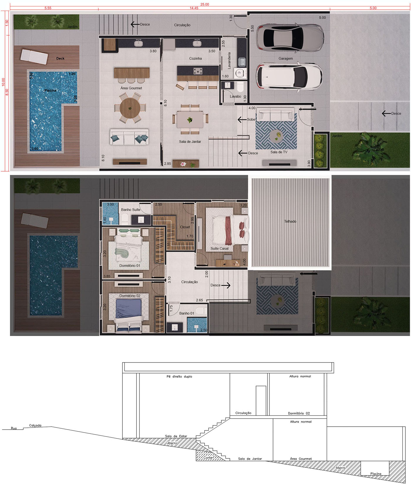 This project is perfect for those who have a land with a slope and want a townhouse, with an imposing and modern facade. This residence was designed for a land with a slope of 4m, and with 3 levels separating the environments. It has a TV room at the entrance, right after, on the lower level we find the entire social area of the house, with kitchen, dining room, laundry room, a spacious gourmet area and swimming pool in the background. On the upper level there are 3 cozy bedrooms, one of which is a suite with dressing room. On the façade, we can observe a smooth ramp for the entrance of cars, which allows better use of the uneven terrain.